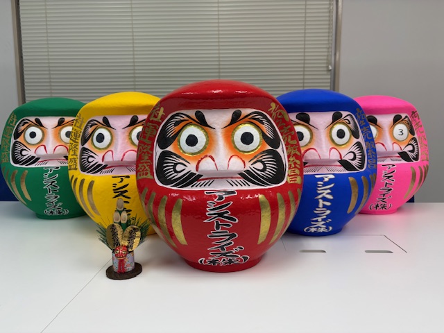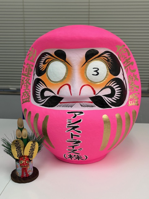 こちらも恒例のだるまです。「七転び八起き」の精神で頑張ります! 今年はなんとピンクにしました!